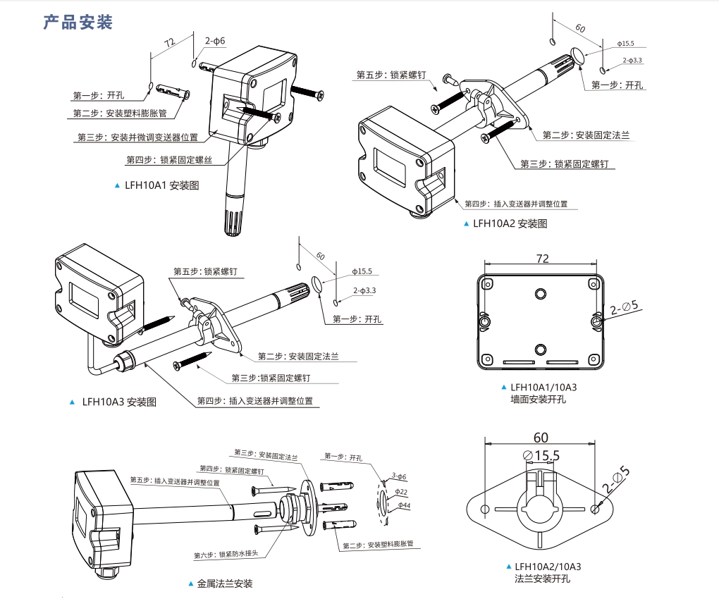 1.LFH10A2建議使用法蘭附件安裝,插入深度可調節。用二個螺絲固定安裝法蘭在風管上,法蘭上的螺絲可以鎖緊插入的探頭
