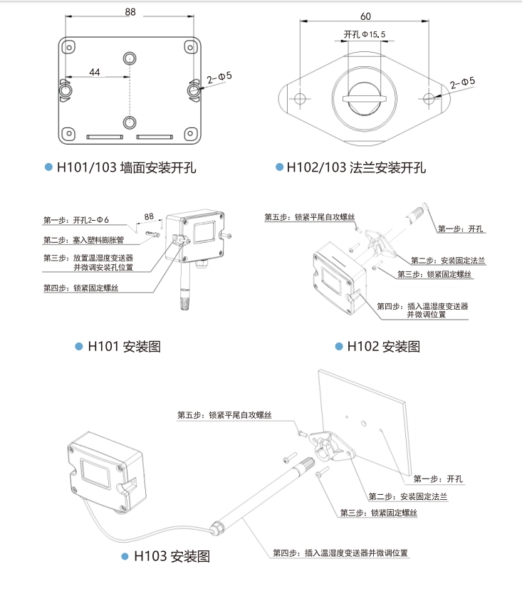 2.H101/103掛墻安裝時(shí)應(yīng)垂直,并注意探頭朝下。安裝位置應(yīng)遠(yuǎn)離影響測(cè)量的因素,如冷、熱源等,并應(yīng)避免陽(yáng)光直射或雨淋,必要時(shí)應(yīng)另行安裝遮陽(yáng)板或防雨罩。在安裝平面處按照安裝圖的開孔尺寸(見上圖)開2個(gè)固定孔,再用2顆螺絲固定底盒。H103探頭管安裝描述與H102使用法蘭安裝相同。