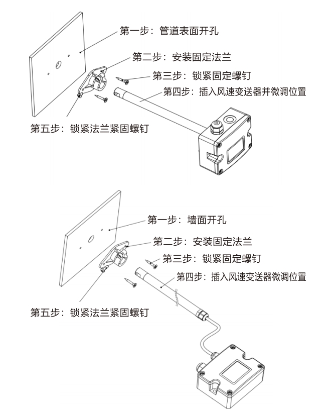1.LFS11風速變送器建議使用法蘭附件安裝,插入深度可調節。用二個螺絲固定安裝法蘭在風管上,法蘭上的螺絲可以鎖緊插入的探頭。風管開孔為φ15.5mm.探頭安裝完畢后要對風管做好密封,以免漏氣。